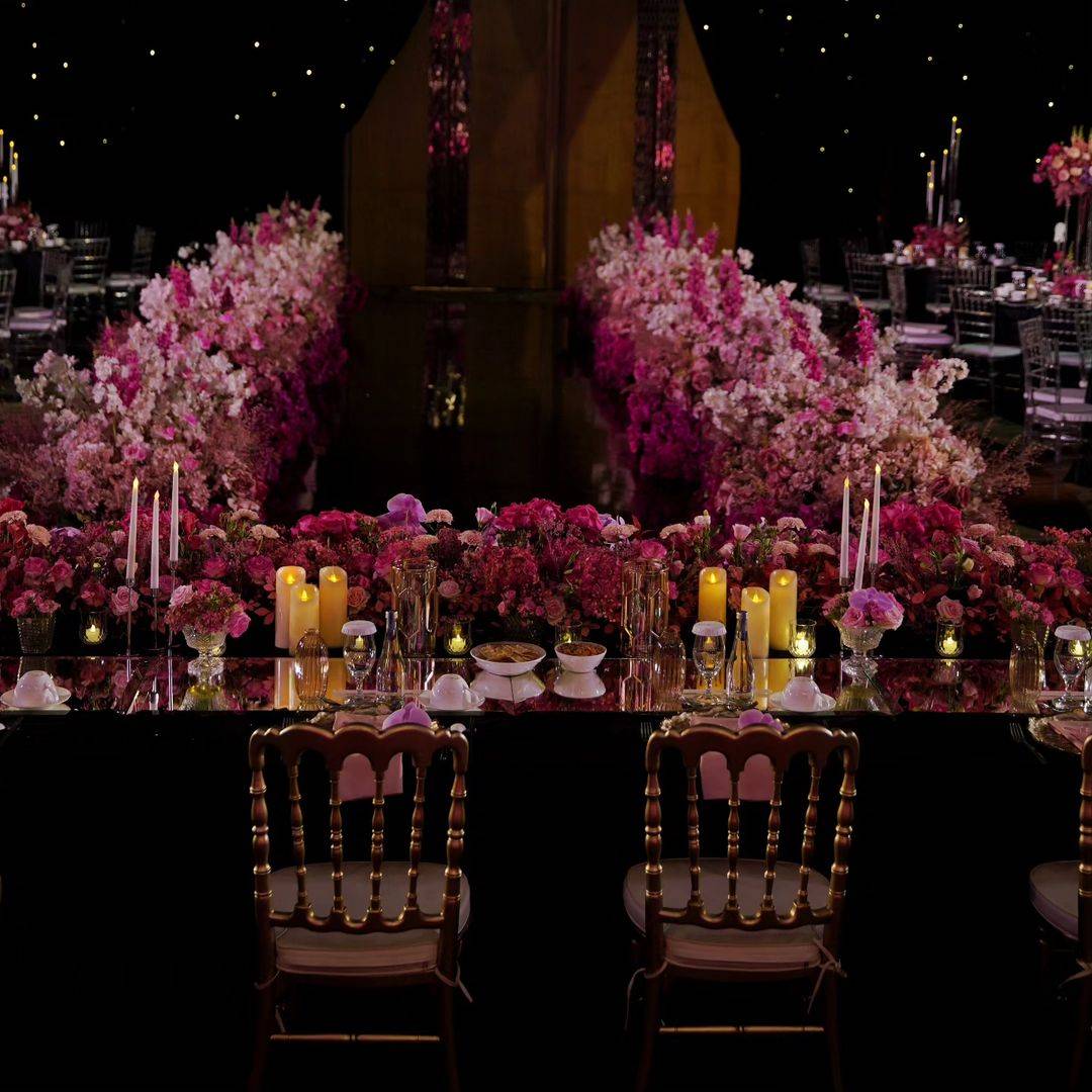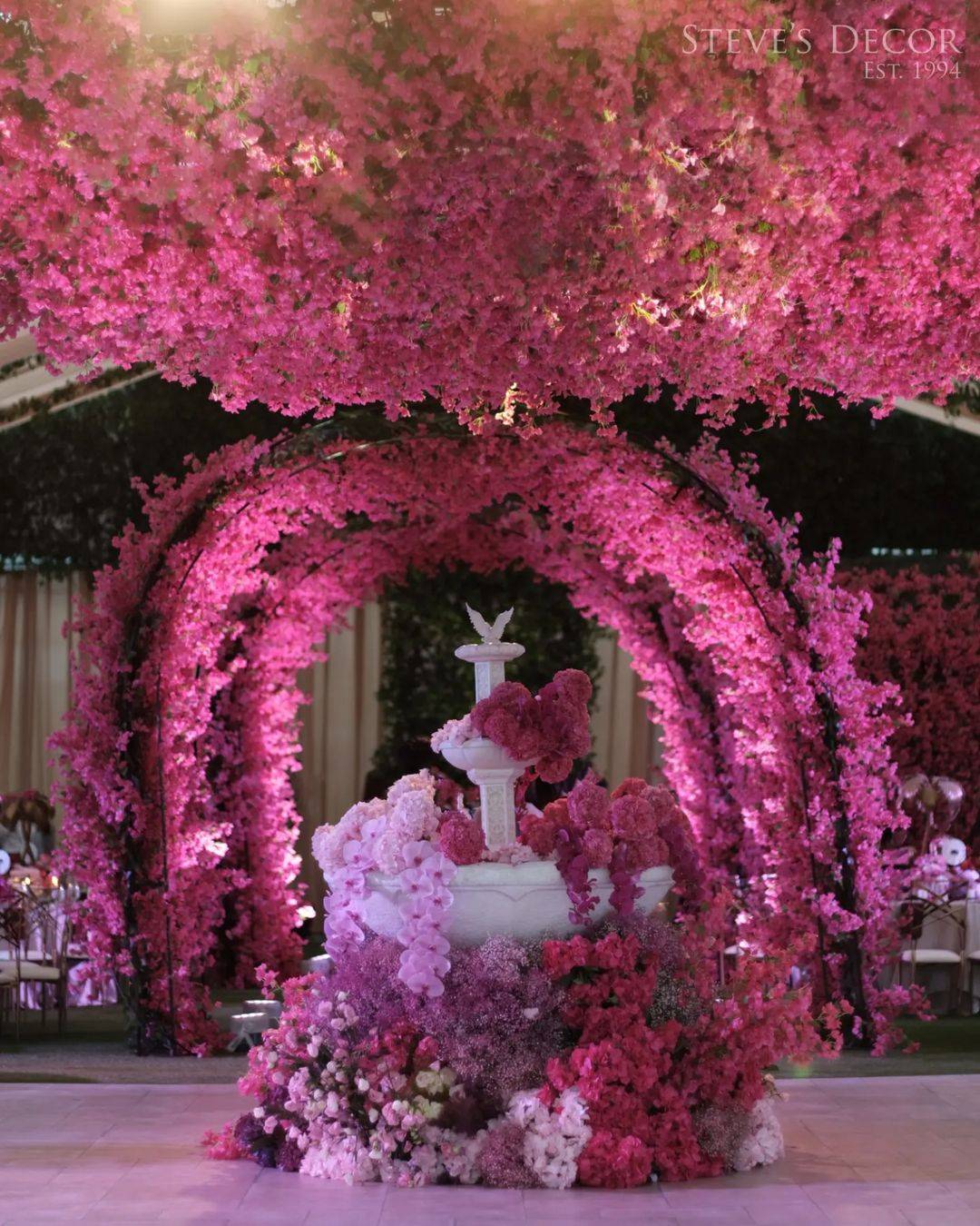 Warna pink memberikan kesan ceria dan juga merupakan warna yang bersifat feminin, simbol cinta dan harapan untuk kehidupan yang baik. Kamu bisa menambah dekorasi bright pink flowers di fountain yang terdapat di dalam atau luar gedung atau dining area untuk memperkaya kesan glamor di setiap sudut venue. Kamu juga bisa memilih warna dusty pink untuk alternatif warna yang lebih subtle dan lembut.