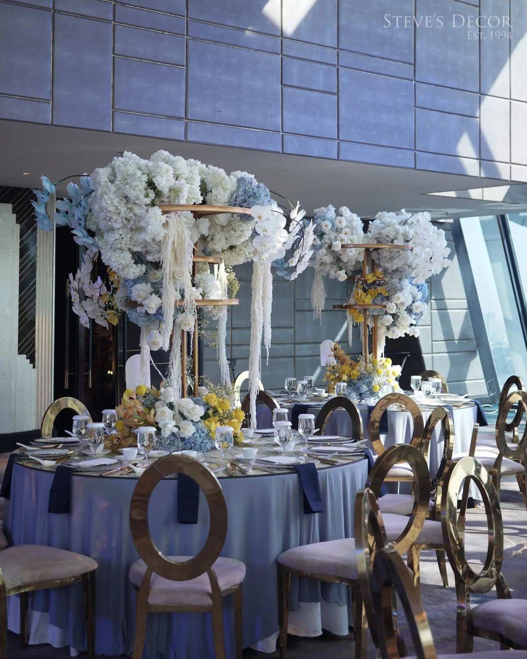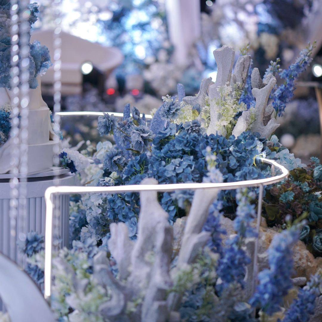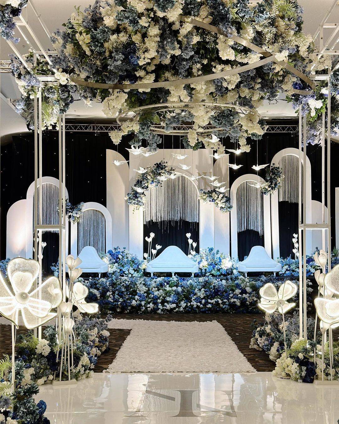 Warna biru dalam ikatan janji cinta melambangkan keanggunan, stabilitas, dan kesetiaan. Biru juga memberikan kesan ketenangan di mana pun mata memandang. Kamu bisa mendekor blue flowers di instalasi panggung, ceiling, atau sepanjang aisle. Kamu juga bisa menambahkannya di instalasi meja makan tamu untuk kesan mewah dan eksklusif.