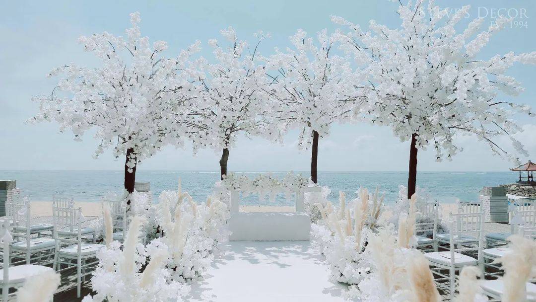 Kamu bisa memilih dekorasi warna putih untuk merepresentasikan kebaikan, kesucian, dan kesempurnaan. Hias chandelier dengan draping white flowers, white flowers yang ditaruh di sekeliling aisle, atau dekorasi dining dengan bunga putih dalam vas kaca untuk menambah kesakralan prosesi resepsi pernikahanmu!