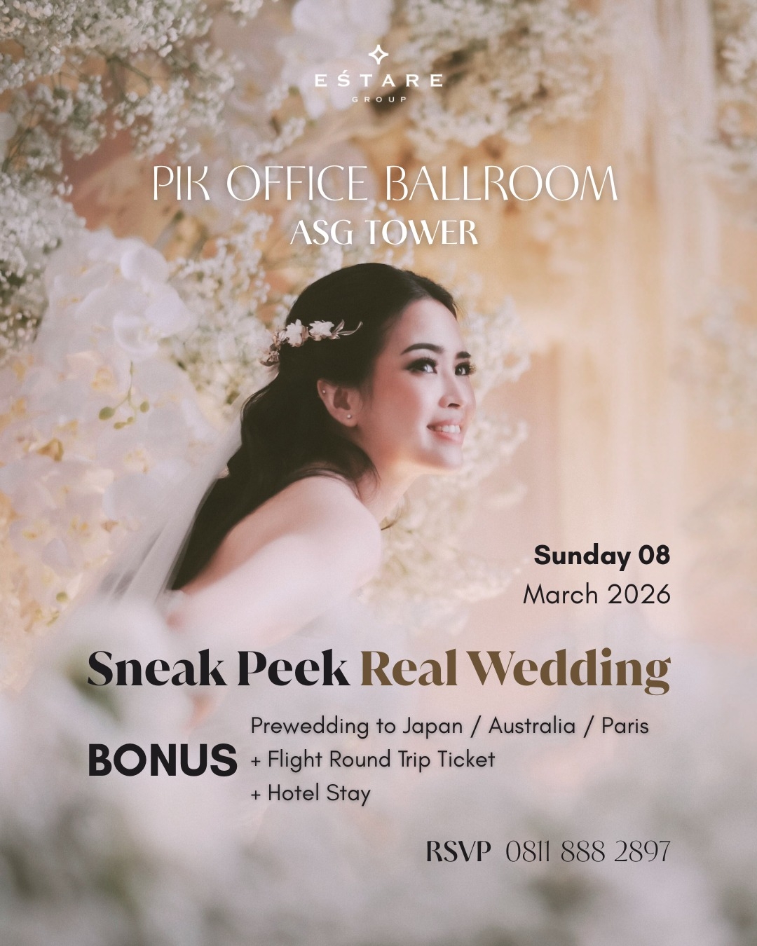Whatsapp Copy Link https://www.weddingku.com/events-promo/in-house/1012929-estare-group-sneak-peek-real-wedding-pik-office-ballroom Sneak Peek Real Wedding | PIK Office Ballroom - Estare Group Booking Periode: 8 Mar-8 Apr 2026 Sneak Peek Real Wedding PIK OFFICE BALLROOM ASG TOWER Bonus : Prewedding to Japan/Australia/paris Flight Round Trip Ticket Hotel Stay