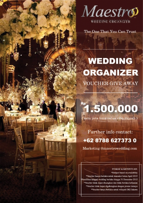 Rp. 1.500.000 (Satu Juta Lima Ratus Ribu Rupiah) Syarat & Ketentuan : - Subject based on availability - Voucher hanya berlaku untuk transaksi bulan April 2015 - Pemilihan tanggal wedding berlaku hingga 31 Desember - Voucher tidak dapat diuangkan dan tidak berlaku kelipatan - voucher tidak dapat digabungkan dengan promo lainnya - voucher hanya berlaku untuk wilayah DKI Jakarta Further info Contact : 08788 6273 730 / markering@maestrowedding.com