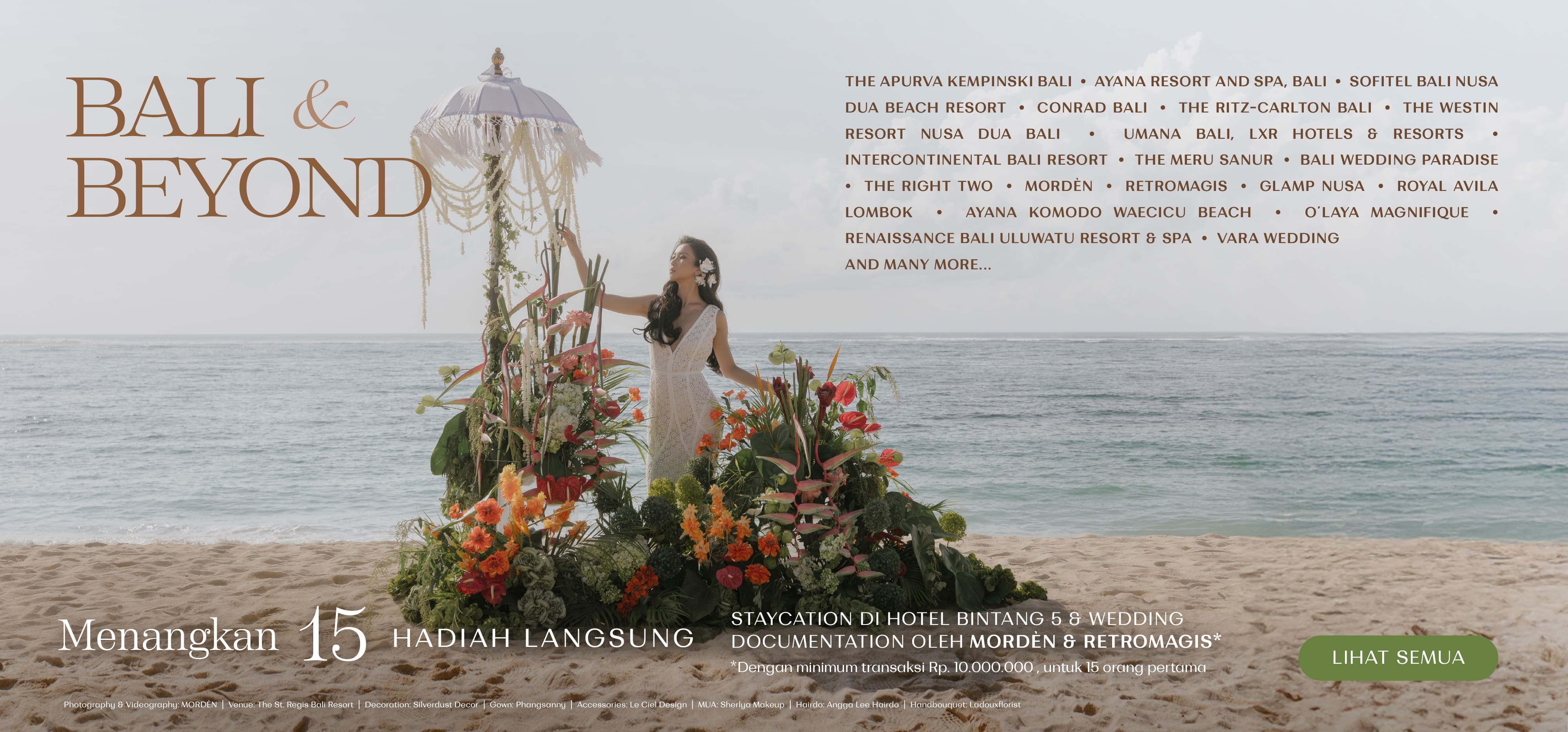 Menghadirkan lebih dari 25 vendor pernikahan Bali & Beyond mulai dari hotel bintang lima dan venue eksklusif, wedding organizer yang berpengalaman, fotografi dan dekorasi. Semua layanan ini disajikan secara lengkap untuk memfasilitasi setiap detail pernikahan impian Anda.