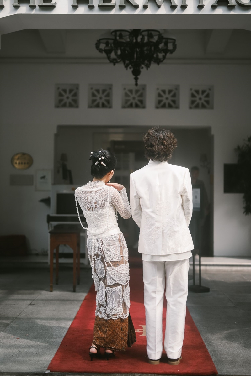Share your meaningful story through our stitches. Classic javanese in Regency-core. Romanticism and tradition all wrapped into one. Up close and personal, it`s the details that make the dress. Subtly incorporate with Georgian ornaments from Ackermann`s Repository of Art archive and the groom`s favorite plants, this kebaya is made from custom embroidered tulle with the illustrations of various decorations, such as tiles, handmade lace, and frames.