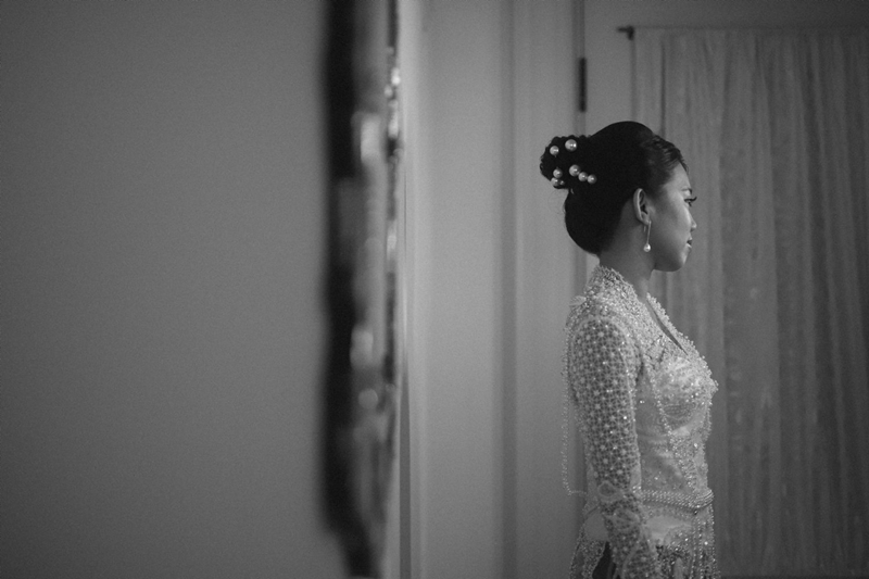 The classic silhouette, blended with 3D beadings to make an enchanting pearlescent texture. The kebaya is entirely hand beaded that we carefully applied following the complexity of the illustration. Subtle yet striking pearly chains decorated Bianda`s waist to put on a little drama on her classic look. A brilliant way to add the perfect amount of statement with effortless ease.