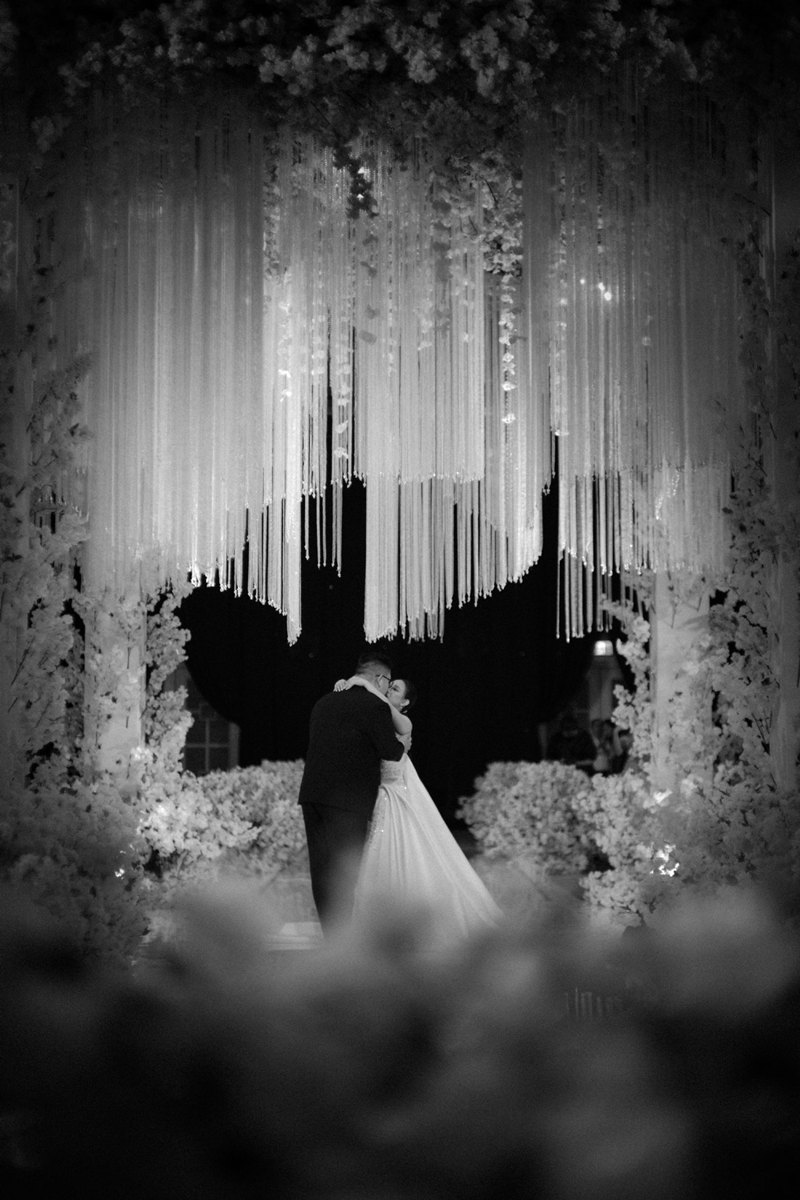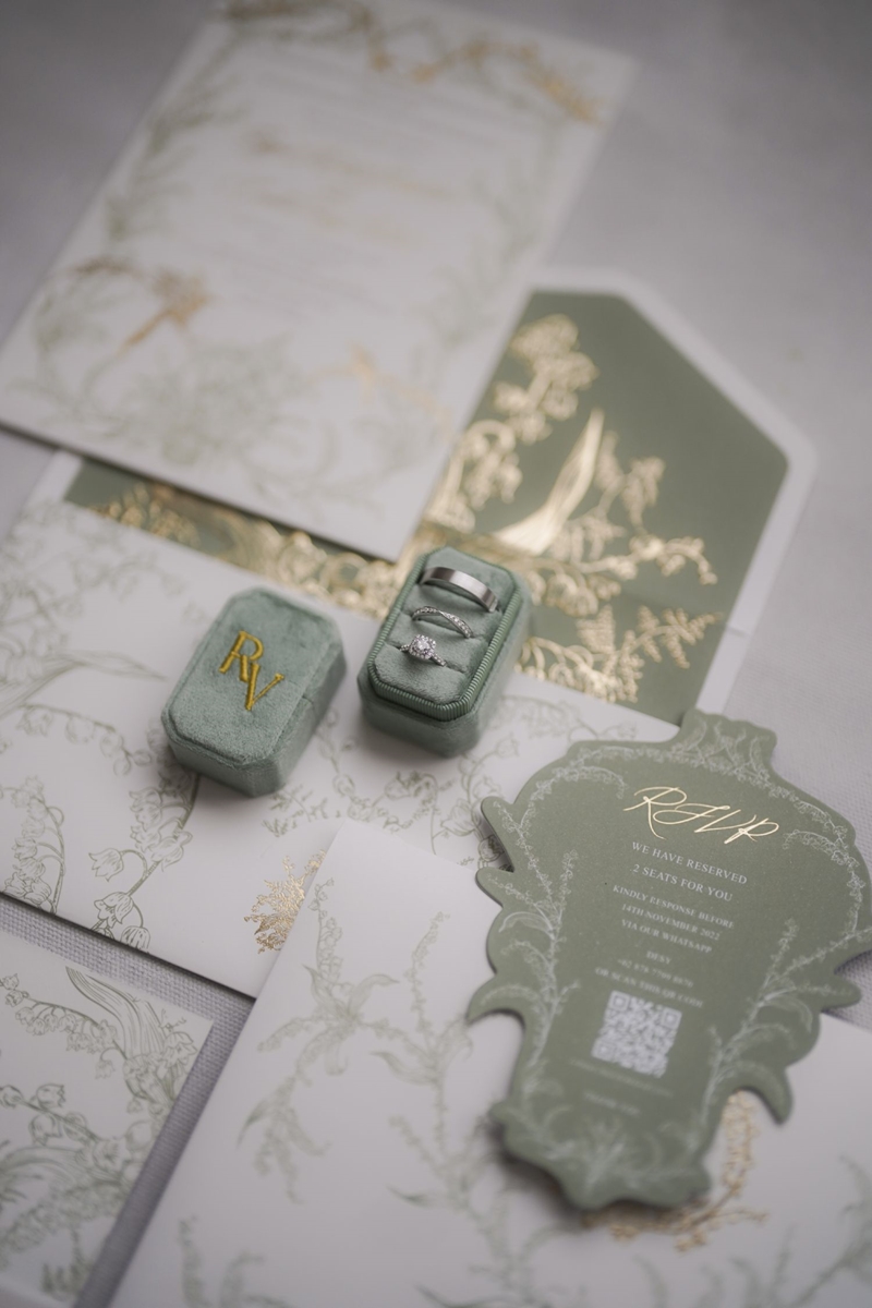 Invitation full of lily of valley flowers that has a deep meaning of happiness. Combined with a pair of extinct honey creeper bird, hawaii oo which has a beautiful voice and a symbol of true love.